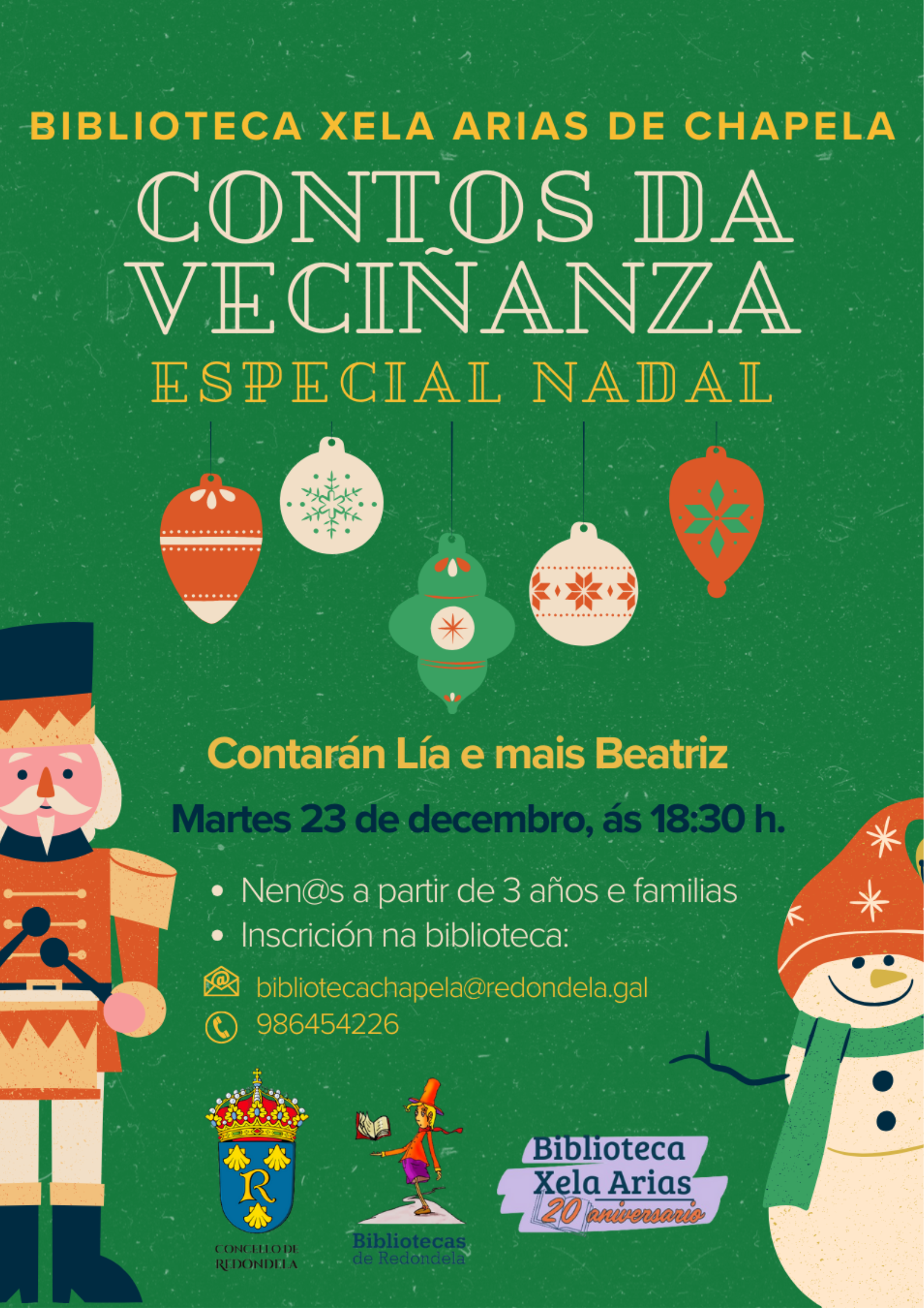 - A Biblioteca Xela Arias de Chapela, festexará o Nadal achegando cun especial para estas datas dos seus “Contos da Veciñanza, especial Nadal”, grazas á participación das usuarias Lía e mais Beatriz.