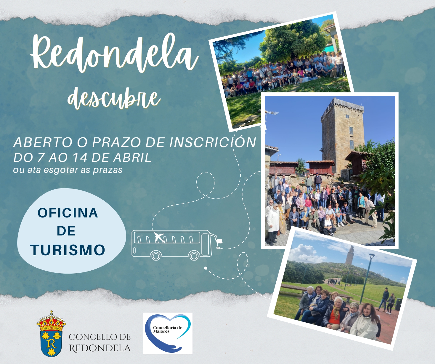 A programación arrancará este mesmo mes de abril cunha excursión ao Grove con tres saídas, os días 27, 28 e 29 de abril. O programa está dirixido a todas as veciñas e veciños de Redondela maiores de 55 anos. As persoas interesadas en participar deberán formalizar a súa inscrición na Oficina de Turismo de Redondela. O prazo permanecerá aberto do 7 ao 14 de abril, ou ata que se esgoten as prazas dispoñibles. O horario de atención ao público é de martes a domingo, de 11:00 a 14:00 horas pola mañá, e de 16:00 a 19:00 horas pola tarde.