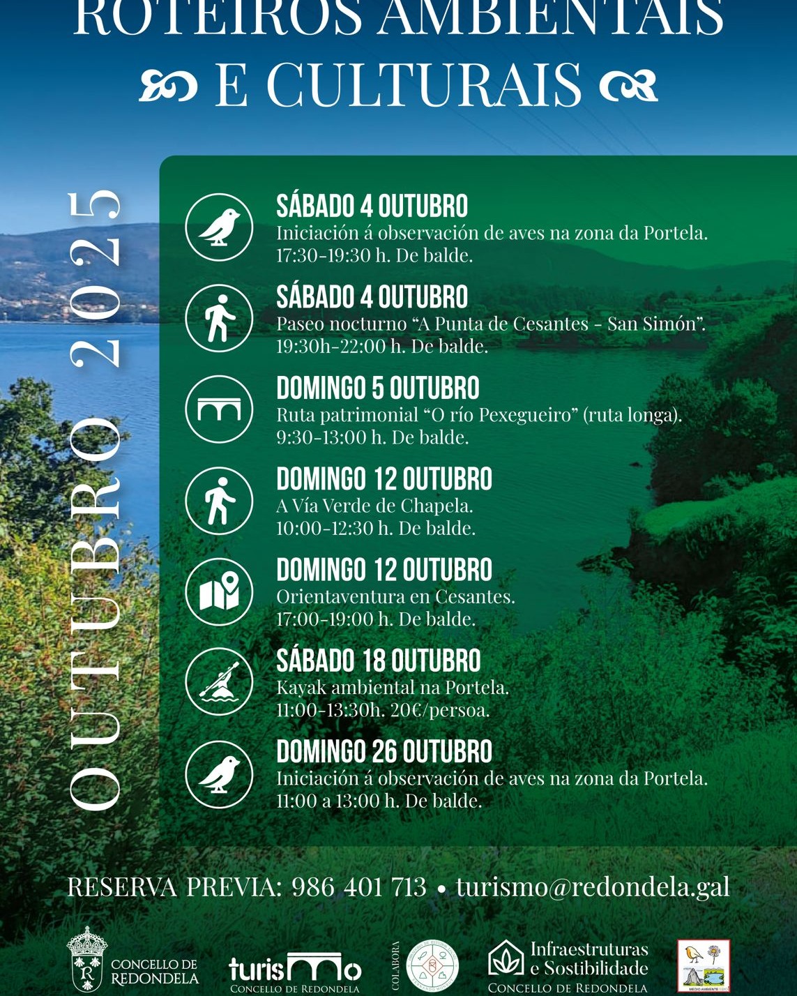 Oficina de Turismo de Redondela Rúa Isidoro Queimaliños nº 2, Redondela, Pontevedra, SpainOS ROTEIROS AMBIENTAIS E CULTURAIS continúan en OUTUBRO con actividades para TODAS AS IDADES Inscrición previa na oficina de turismo, rúa Isidoro Queimaliños 986 40 17 13 turismo@redondela.gal