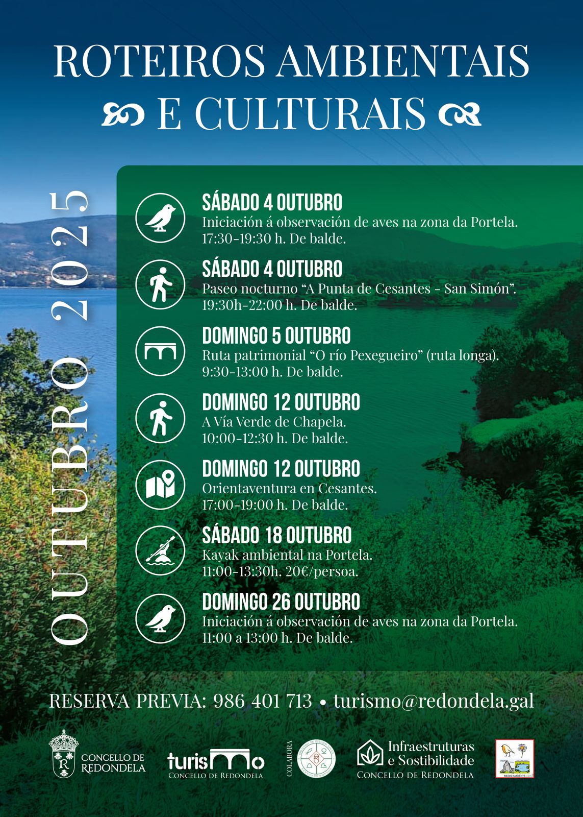 O Concello de Redondela ofrece no mes de outubro un total de sete actividades de turismo ambiental e cultural para público de todas as idades. Logo do éxito da programación de verán, as concellerías de Turismo, Sostibilidade e Medio Ambiente continúan con propostas a pé e en caiac que se realizan sempre con guías profesionais. A concelleira de Cultura e Turismo, Rita Pérez, destacou a «transversalidade» destas actividades “que apostan polo turismo sostible e responsable con saídas para coñecer o espectacular patrimonio natural e cultural de Redondela”. O concelleiro de Sostibilidade, Roberto Villar, sulila que o obxectivo destas actividades é “poñer en valor os recursos naturais de Redondela e tamén concienciar á veciñanza e ás persoas que nos visitan da importancia de respectar estes espazos e axudar a conservalos”.