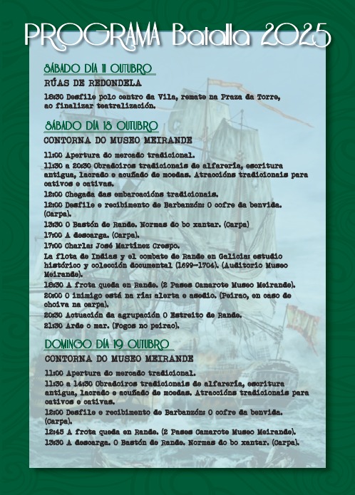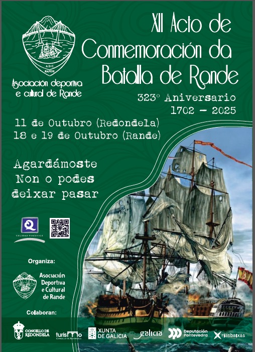– A XII Conmemoración da Batalla de Rande celebrarase os días 11 de outubro na vila de Redondela cun desfile e o 18 e 19 na contorna do museo Meirande. A cita, que recrea a batalla naval de 1702, contará cun mercado tradicional, obradoiros de oficios antigos, concentración de embarcacións tradicionais e recreacións teatrais.