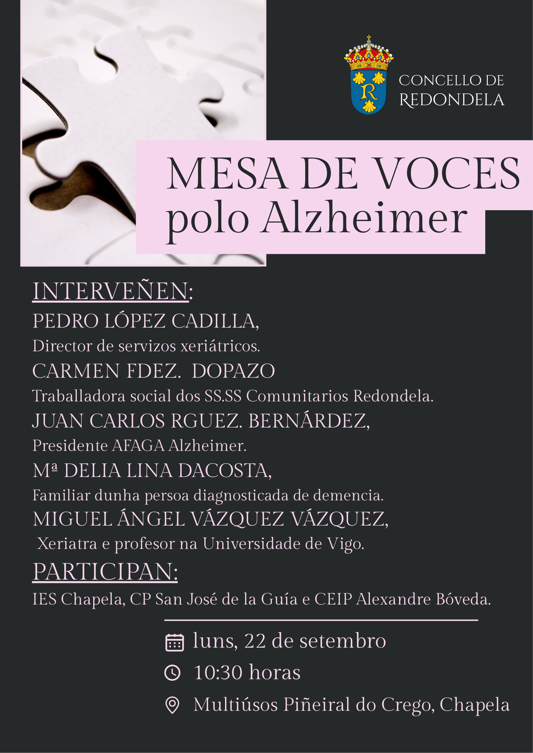 O Concello de Redondela conmemora o Día Mundial do Alzhéimer cunha mesa redonda titulada “Voces polo alzhéimer”. Será o luns, 22 de setembro, ás 10.30 horas no auditorio do Piñeiral do Crego, Chapela. Contará coa presenza de profesionais da xeriatría, medicina, servizos sociais e familias de afectados. A alcaldesa, Digna Rivas, e a concelleira de Servizos Sociais, Iria Vilaboa, presentaron esta xornada “que pretende ser unha conmemoración especial para as persoas que sofren esta enfermidade, é dicir, a quen a padece, para as súas familias, e tamén para os profesionais que axudan a sobrelevala”.