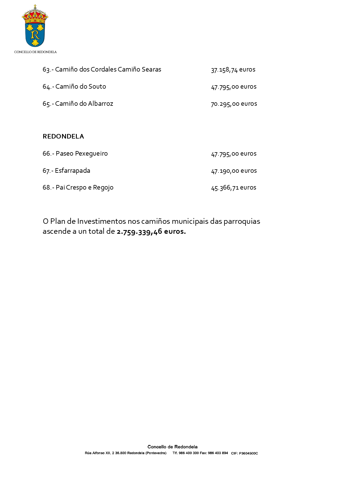 O plan de investimentos recolle obras nun total de 68 camiños municipais. Algunhas das actuacións máis destacadas serán na rúa Estación e a Subida ao Picoto, (Chapela); os camiños da Milixosa e dos Lagos (Cabeiro); os camiño das Telleiras, o Fixón e Chousa ( Vilar); os camiños do Casal, Tereixos e estrada do Abeal (Reboreda); a Subida a Trasmañó, o camiño da Cabadesa, estrada da Lamosa máis camiño Minada (Trasmañó); os camiños Costeira, Verdeal e Fonte da Lama (Quintela); os camiños do Quintán, Moscalleira e Outide de Abaixo (Cedeira); camiños das Patelas e Miñoteira-Estrada Fontecova (Ventosela); camiños da Furna, Eido de Andrea, Panquente, Fonte do Rial e rúa Outeiro das Penas (Cesantes); camiños do Sapal, Fixón e Caiosa ( Negros); estrada da Nogueira, camiños da Gándara e Carreira da Lagüiña (Viso); camiños das Pedreiriñas, Casal do Monte, Souto e Albarroz (Saxamonde) e o Paseo Pexegueiro, Esfarrapada, Pai Crespo e José Regojo (Redondela).