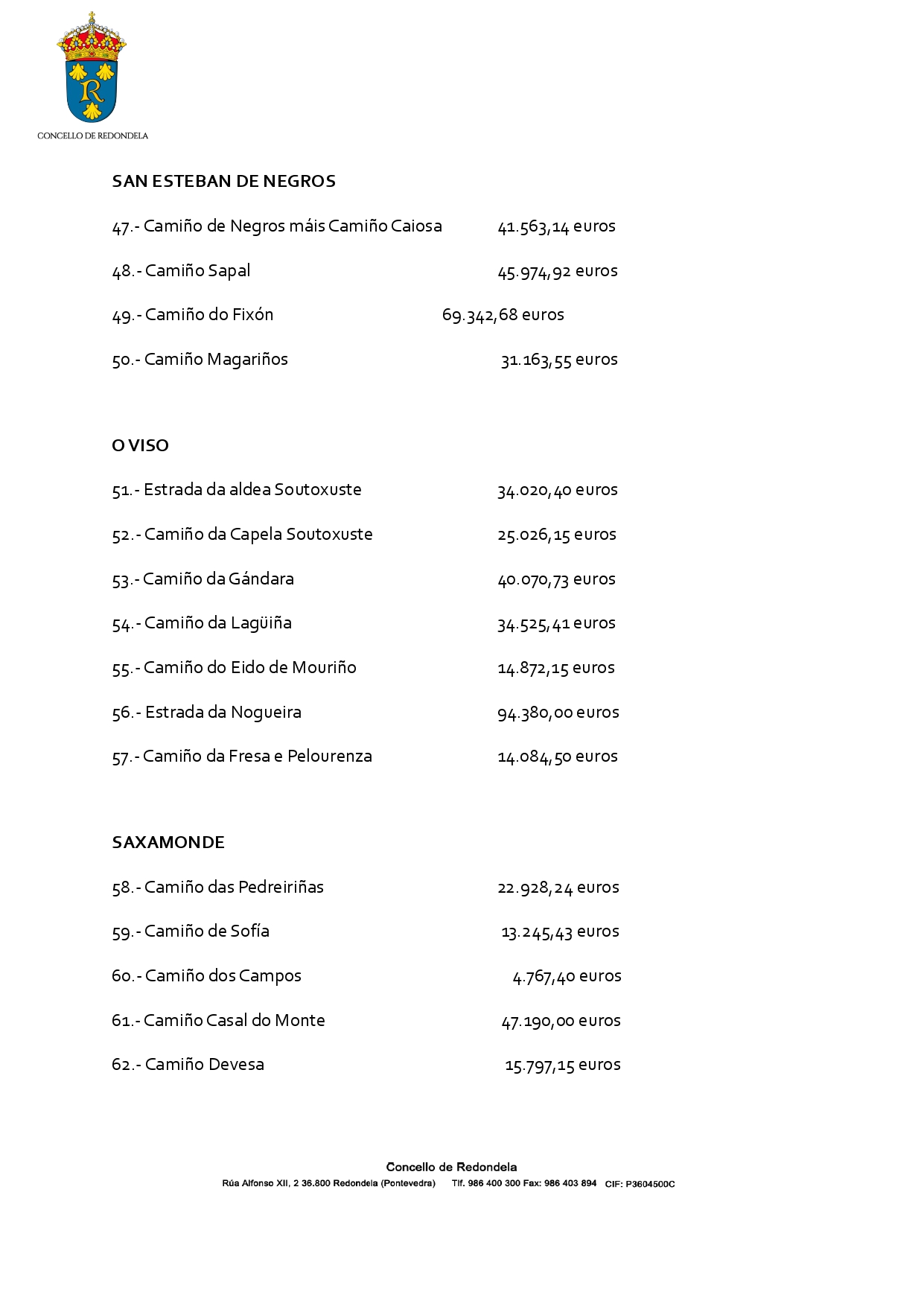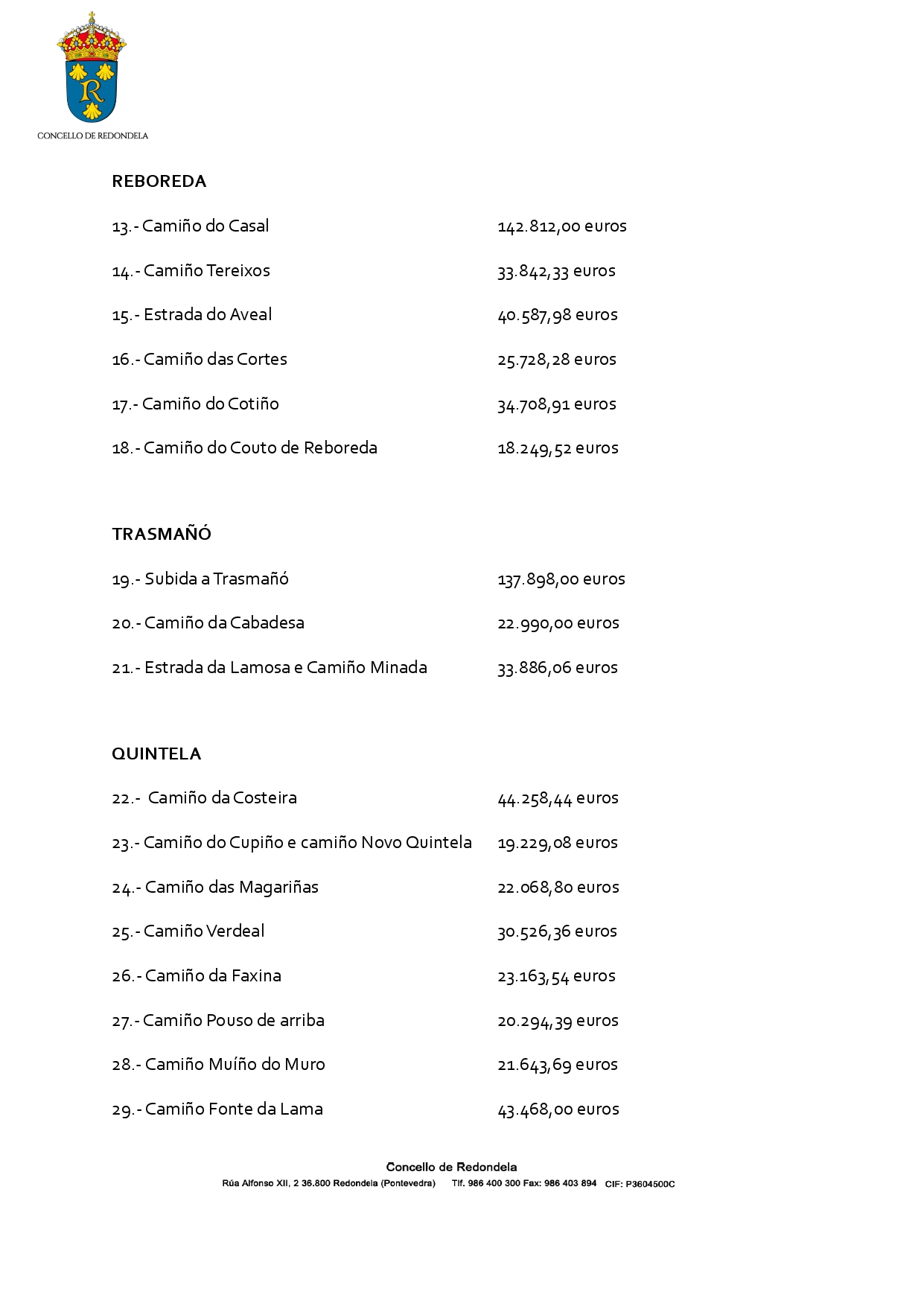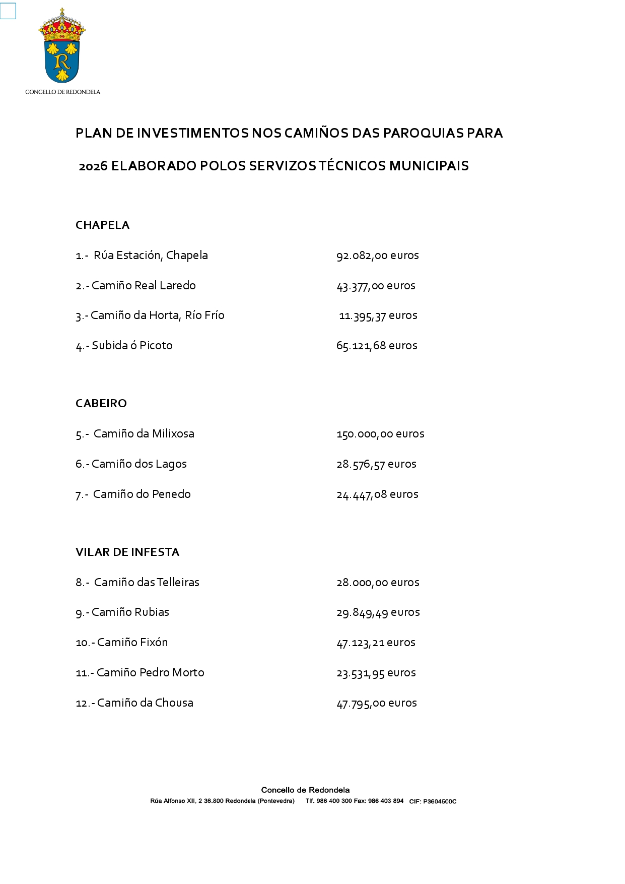 O plan de investimentos recolle obras nun total de 68 camiños municipais. Algunhas das actuacións máis destacadas serán na rúa Estación e a Subida ao Picoto, (Chapela); os camiños da Milixosa e dos Lagos (Cabeiro); os camiño das Telleiras, o Fixón e Chousa ( Vilar); os camiños do Casal, Tereixos e estrada do Abeal (Reboreda); a Subida a Trasmañó, o camiño da Cabadesa, estrada da Lamosa máis camiño Minada (Trasmañó); os camiños Costeira, Verdeal e Fonte da Lama (Quintela); os camiños do Quintán, Moscalleira e Outide de Abaixo (Cedeira); camiños das Patelas e Miñoteira-Estrada Fontecova (Ventosela); camiños da Furna, Eido de Andrea, Panquente, Fonte do Rial e rúa Outeiro das Penas (Cesantes); camiños do Sapal, Fixón e Caiosa ( Negros); estrada da Nogueira, camiños da Gándara e Carreira da Lagüiña (Viso); camiños das Pedreiriñas, Casal do Monte, Souto e Albarroz (Saxamonde) e o Paseo Pexegueiro, Esfarrapada, Pai Crespo e José Regojo (Redondela).