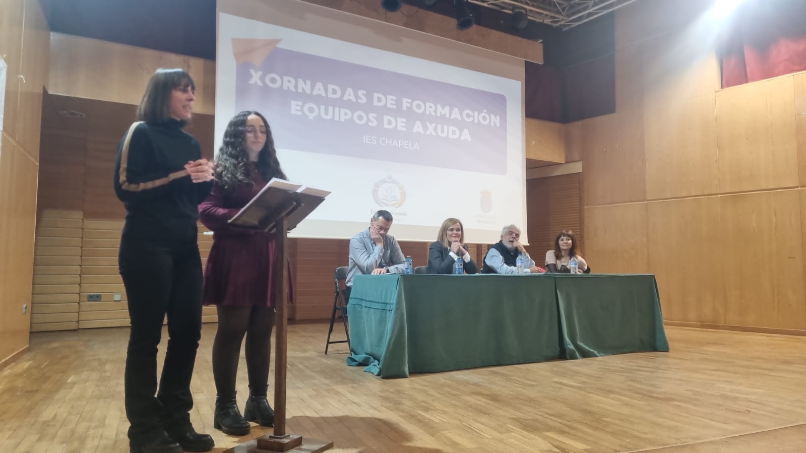 – O auditorio da Xunqueira acolleu durante dous días as xornadas de formación de “Equipos de Axuda” do IES Chapela para mellorar a convivencia escolar. A alcaldesa, Digna Rivas, e a madriña do evento, a actriz Arantxa Treus, entregaron os diplomas aos alumnos e alumnas de ESO que se formaron na resolución pacífica de conflitos.