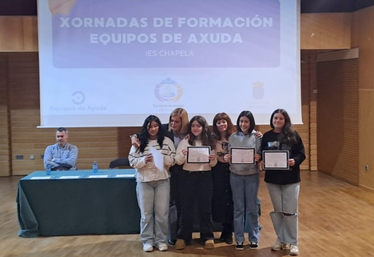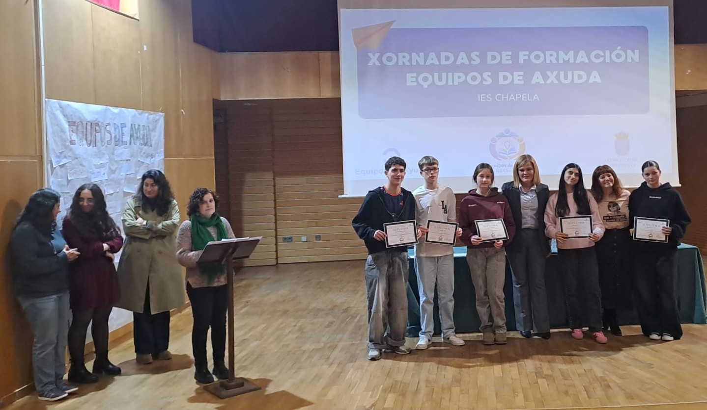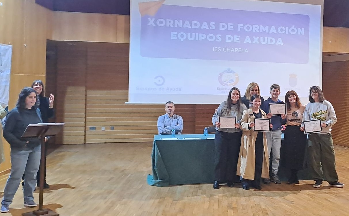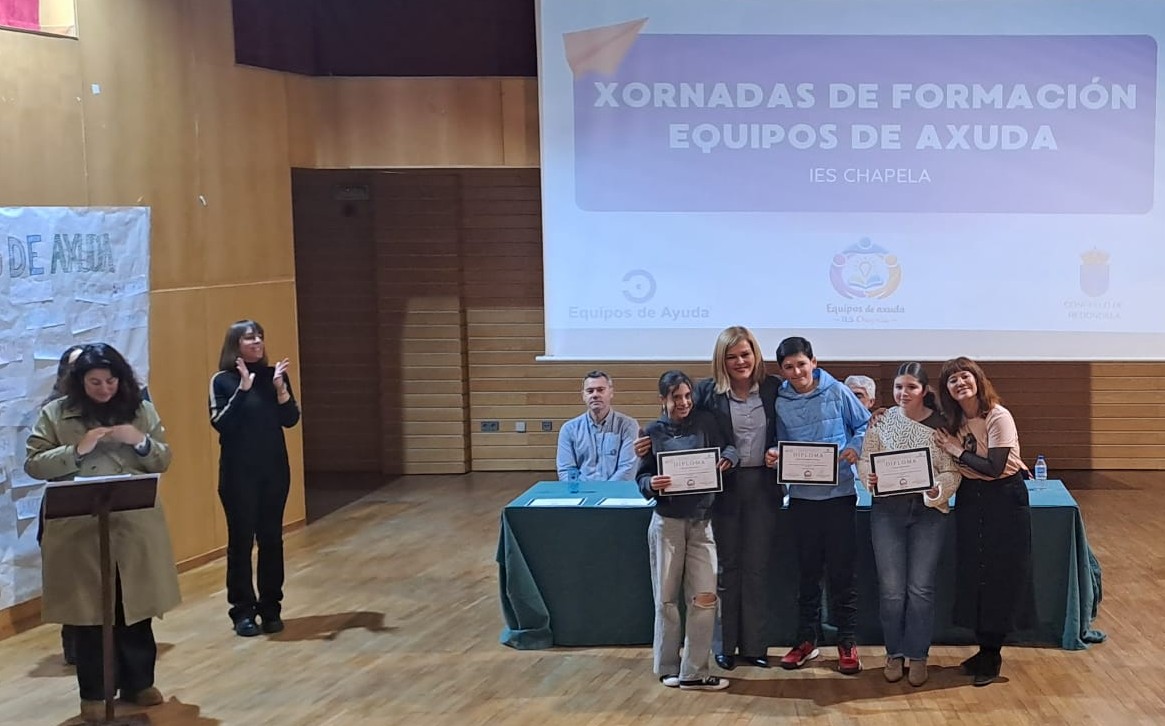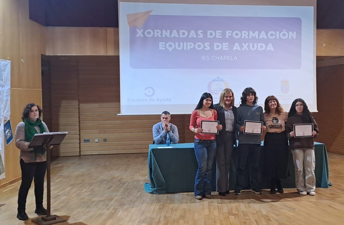 – O auditorio da Xunqueira acolleu durante dous días as xornadas de formación de “Equipos de Axuda” do IES Chapela para mellorar a convivencia escolar. A alcaldesa, Digna Rivas, e a madriña do evento, a actriz Arantxa Treus, entregaron os diplomas aos alumnos e alumnas de ESO que se formaron na resolución pacífica de conflitos.